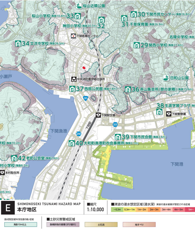 想定地震:下関市庁舎の直下地震 震度6強 台風・豪雨・浸水:高潮による浸水想定区域内(海抜0.5m) 液状化:下関駅周 辺及び彦島の西岸に液状化の可能性あり 交通被害 道路:191号線から海側は液状化の可能性あり |