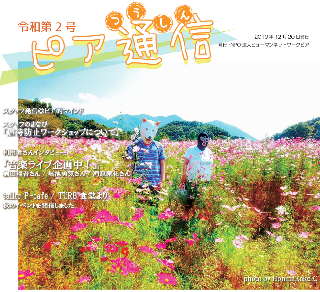 あっという間に冬がやってきました。これまでつるはち食堂の担当としてランチ営業を主に業務としていたのですが、ピア通信を担当するようになり、デイサービスのイベントごとに一緒に同行する機会が増えたからか、ここ数年でいちばん季節の移りかわりを肌で感じた3か月でした。当たり前のことではありますが、数年前デイサービスに関わっていた頃とは利用者さんやスタッフの顔ぶれも変わっており、同じ空間でもそこに居る人や皆さんの過ごし方が日々変化していることを実感します。2019年の残りの日々も大切に丁寧に過ごし、ピアの皆さんと元気に2020年を迎えたいと思います。次回のピア通信もお楽しみに。。