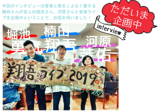 今回のインタビューは音楽と歌をこよなく愛する楠田さんが売宇人の堀池さん、河原さんと音楽ライブを企画中ということで、お話を伺いました!