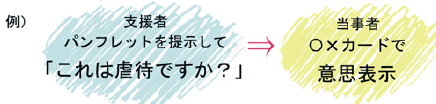 今回私は「虐待防止ワークショップ」というものが紹介されました。手法としては、支援者が用意した「虐待の絵などのわかりやすいパンフレット」「意思表示のための〇×カード」を使い、グループになった当事者の皆さんに虐待ついて「主役」となって考えていくものです。