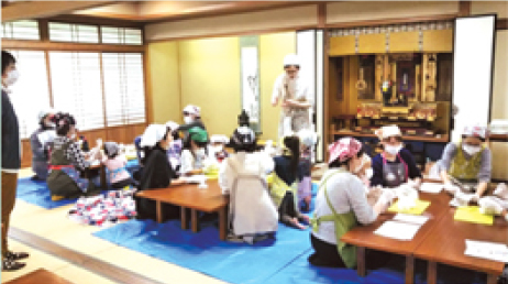 ポリ袋だけで生地をつくる焼き菓子や、寒天でつくるやわらかいフルーツゼリーなど4種のスイーツを協力して作りました。お菓子が焼けるのを待つ間にはお坊さんによる「命をいただく」というテーマのご法話もあり、たくさんのご家族と「食べる」ことについて考える素敵な時間となりました。